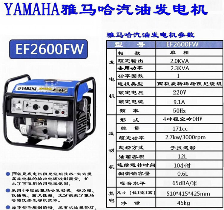 雅马哈汽油发电机 EF2600FW